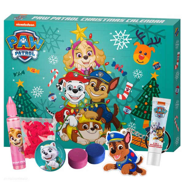 Adventní kosmetický kalendář „Holiday Heroes“ Tlapková patrola – obsahuje hračky a hlavně kosmetiku a příslušenství na koupání do vany.
