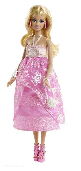 Barbie v luxusní večerní robě. Šaty mají pro ni typickou růžovou barvu a krásné detaily, aby Barbie vypadala neodolatelně.