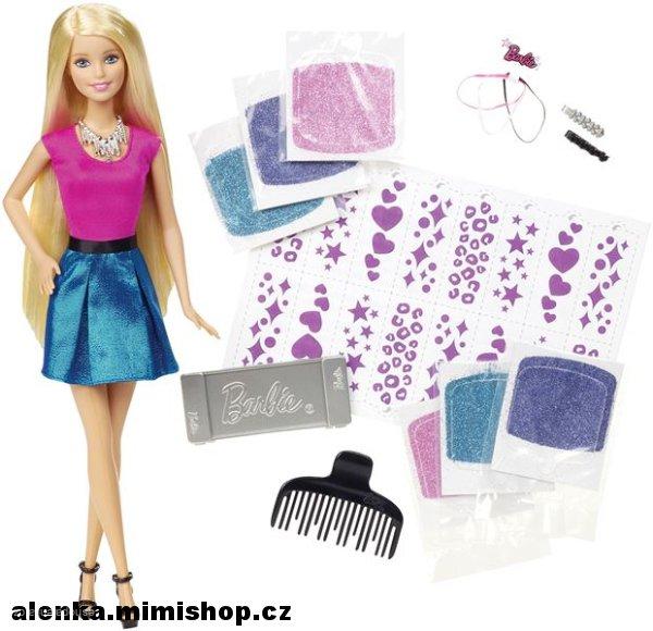 Vytvoř panence Barbie perfektní účes pro každou příležitost! Krása, móda, zábava a to vše bez nepořádku kolem! Zahraj si na kadeřnici a vyráběj panence dokonalé blyštivé účesy. Díky revolučním přilnavým ploškám, na které se třpytky nalepí, zůstane tvůj pokojíček čistý a vlasy Barbie se budou blýskat barvami. Odděl panence jednotlivé prameny vlasů, zacvakni je do kadeřnického nástroje a vyber si účes! Potom se rozhodni, jakou barvu třpytek zvolíš. Na výběr jsou 3 a každá je v balení dvakrát. Nakonec sleduj zářivou proměnu! Tím to ale nekončí, sada obsahuje také sponky a gumičky, takže úprava vlasů může pokračovat. Když tě účes začne nudit, umyj a usuš panenčiny vlasy, pak můžeš začít nanovo! Barbie je jako vždy módně oblečena a jako doplňky ji tentokrát posloužily boty na podpatku a náhrdelník. S tvým účesem bude vypadat bezchybně! Kombinuj různé barvy a styly, dokud nebudeš se vzhledem Barbie naprosto spokojena. Balení obsahuje oblečenou panenku Barbie, doplňky, nástroj na úpravu vlasů, 6 sad třpytek, 16 originálních vzorů, 2 sponky, 3 gumičky a hřebínek. Panenka neumí stát samostatně. Barvy a doplňky se mohou lišit.