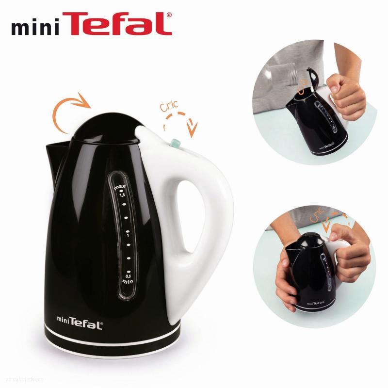 Věrná replika rychlovarné konvice mini Tefal "Express" jako doplněk pro kuchyňky od Smoby. Víko lze otevřít. Mechanická funkce: po stisknutí spínače se generuje zvuk varu vody. Rozměry (DxŠxV): 8 x 8 x 13,8 cm.